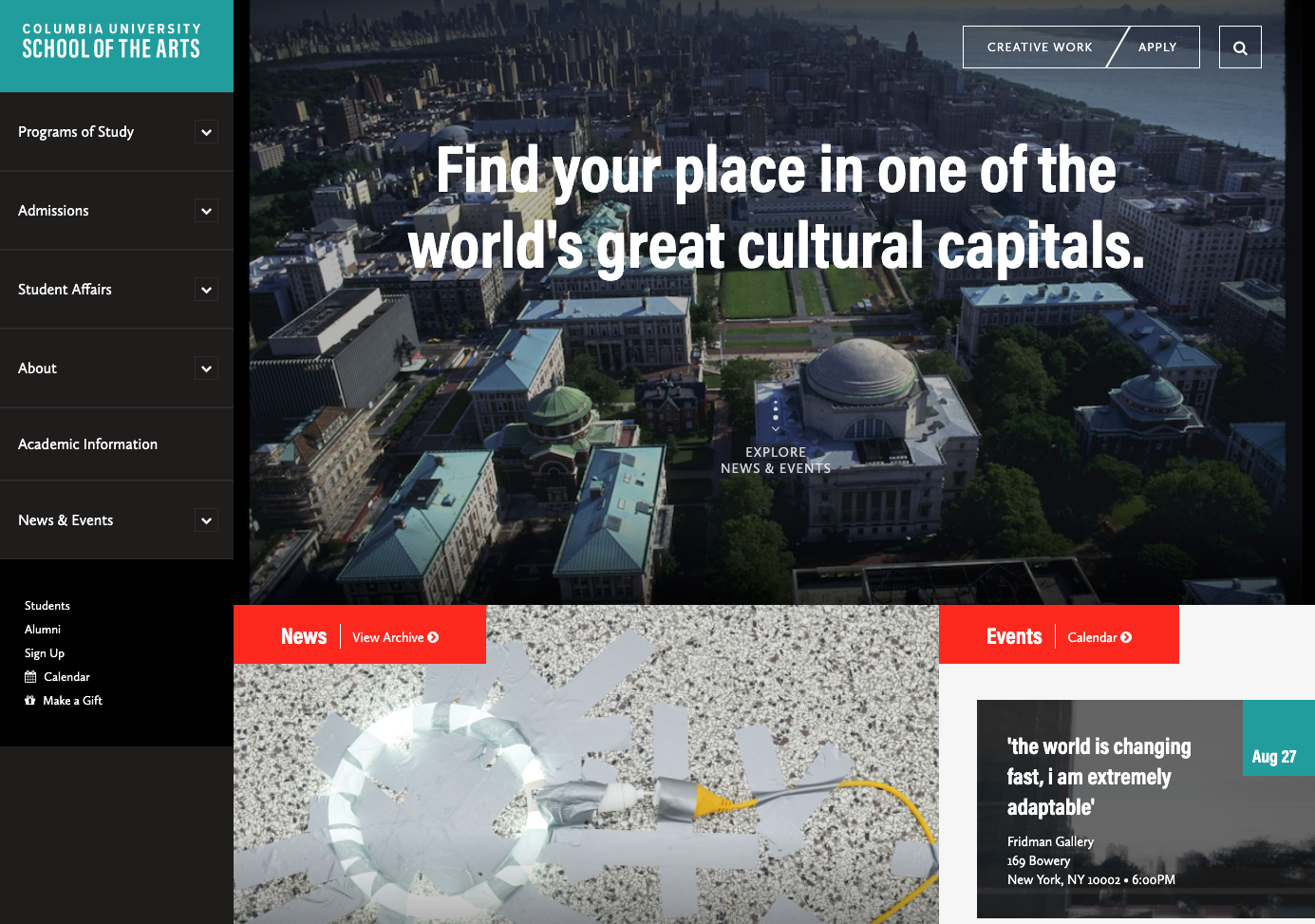 The School of the Arts is comprised of four departments offering degrees in film, theatre, sound arts, visual arts, and writing. The challenge was melding the distinct set of content and user needs unique to each department. Through user research, analytics assessments, and workshops with school leaders we crafted a flexible system that allowed for each department to shine in their own way; while enabling users to quickly find what they need — and keep coming back to do so.